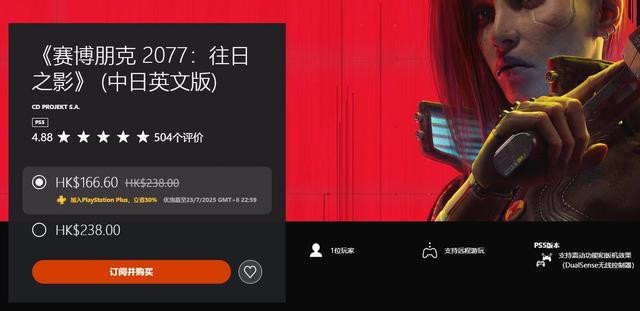 ACG吐槽君feichenpan表示索尼终于大气了一回,让波兰蠢驴的大作给二三档会员白嫖,可惜的是只是PS4/PS5游戏本体免费,要玩赛博朋克2077终极版还需要买一下DLC往日之影。值得一提的是在7月23日前PS+会员玩家可以7折166.6HKD港币的优惠入手DLC往日之影,之前买了数字版游戏的朋友可以考虑升级到终极版。