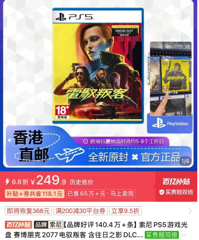 顺带一提,目前某多百亿补贴《赛博朋克2077终极版》港版中文实体碟249.9元全新包邮,终极版包含PS5版本体游戏碟以及DLC往日之影的兑换码,之前买过PS4赛博朋克2077游戏实体碟的玩家可以把PS5碟在咸鱼平台出掉(PS4碟可以免费升级PS5版,所以PS5碟重复了可以卖掉回血),PS5碟大概可以卖170元,相当于80元入手DLC往日之影,这样升级终极版性价比更高,只是折腾点。